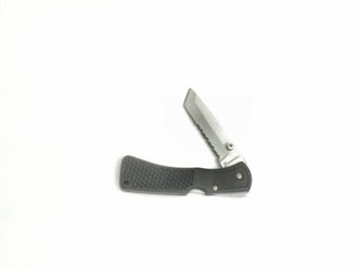 3" closed blade. Tactical Fighter.Stainless Steel Tanto Blade. 3/4 Serrated. Lock Back. Black composition handle.