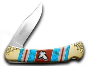 Beautiful BUCK 110 YELLOWHORSE Blue Turquoise & Red Coral & White Bone Eagle Folding Hunter Hand Crafted in U.S.A.