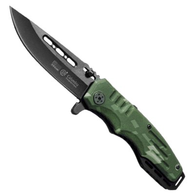 Refined ergonomics' contours from the variations of green camouflaged colors on the stainless steel handle's shape and the grooves that settle the index & middle fingers on the underside, suitable for use, making it long term and strenuous cutting more comfortable. Hollow spine in this black anodized, drop-point blade design is 440C stainless steel, with radial thumb lug, making it harder, higher on the Rockwell scale and in turn extending the amount of time it stays sharp. Dual thumb studs & the kick (flipper) with spring assisted open give fast either-hand opening, and the liner lock release allows easy one-hand closing. Black finished, stainless steel pocket/belt clip with pommel's lanyard holes. The butt also can be use as a striking surface for hitting or glass breaking. With secure, sliding safety locking mechanism on back of the handle, it locks the closed blade in place. This is a great survival knife including a durable black nylon belt sheath with velcro closure. Ideal for military, hunters, hikers, campers and outdoor sport enthusiasts. All Assisted Open Knives have a Star Screw Adjustment to speed up or slow down the action. If your knife doesn't open satisfactorily, adjust the star screw.SKU: 03KS-FKN-0019