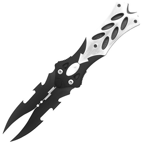 This two-toned double bladed fantasy folding knife with a closed length of 5 inches, features dual 3 1/2 inch ornately designed black finished stainless steel fantasy blades with quick opening thumb pins. The elegantly contoured two-toned aluminum handle is finished in a black and a polished metal color and features the liner lock blade locking system. This attractive double bladed fantasy folding knife comes complete with a durable pocket clip.