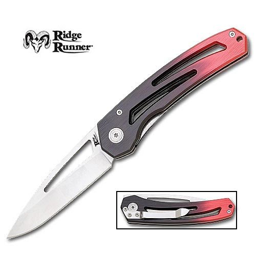 The sleek smooth design of this lightweight pocket knife offers traditional performance combined with futuristic appeal. Equipped with a 3 1/4" stainless steel blade with fantasy cut out. The solid aluminum handle is accented with crisp red and black anodized finish. Includes handy pocket clip. 7 3/4" ov
