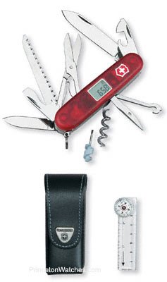 Features: Altimeter Plus knife, Compass w/split level, ruler (in), ruler (cm), Leather belt pouch - Altimeter Plus Expedition Set- Ruby Knife by Victorinox - Swiss Army, model 53522, UPC 046928535224, in Knives Swiss Style, Weight = 0.45 lbs.
