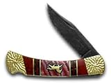 New and never been used or sharpened, this gorgeous knife, is 4 3/4 inches long (folded/fixed) and comes with a Lifetime Warranty! This is a Classic Lockback Folding Knife with a Custom Native Steel blade with CUSTOM and Brian Yellowhorse signature etching. The Tang is Stamped with BUCK 110-1 U.S.A. The Handles are Channel Inlay of Mammoth Tooth, Black and Gold Quartz, and Red Jasper with a Brass Horse Inlay Shield. The Textured, Brass Bolsters are the Custom work of Navajo Artist Brian Yellowhorse. Included with this knife is a Genuine Black Leather Folding Belt Sheath and Certificate of Authenticity. The Sheath is BUCK Knives 110 Embossed. If you are looking for a great knife to collect, carry or give as a gift, don't pass this one up!