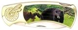 3 inch stainless steel lock blade brass handle with Bear inlay and a wood gift box. Knife is 7 inches overall.