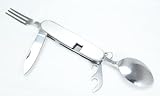 This campers tool is heavy duty; similar to what our brave U.S soldiers use in the field. Equipped with a three-tined fork, 1 1/8" dia. spoon, 2 1/2" long straight edge knife, plus a can/bottle-opener. Great for camping and hiking; this is a nice set for older kids who are ready for their first pocket knife. Another unique feature; when the fork and spoon are flipped opened, the unit detaches into two separate pieces, making the utensils much more efficient! Mini-keyring allows you to attach it to your belt, or rucksack!