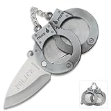 This handcuff knife is perfect for the police officer in your life. A set of cast aluminum handcuffs acts as the handle, complete with a stainless steel chain, and it houses a 2 1/2" stainless steel blade that opens from the inside. The "Police" logo is laser-etched on the blade and a thumb stud offers convenient one-hand opening. 3" closed.