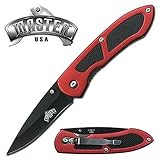 The practical Brushed Red Master folding knife features a sharp 2 3/4 inch stainless steel blade with a resilient matte black finish and a quick opening thumb stud. The comfortably contoured red aluminum handle features textured black rubber inlays and the Liner Lock blade locking design. This attractive folding pocket knife from Master has a closed length of 4 inches and comes complete with a convenient carrying pocket clip.